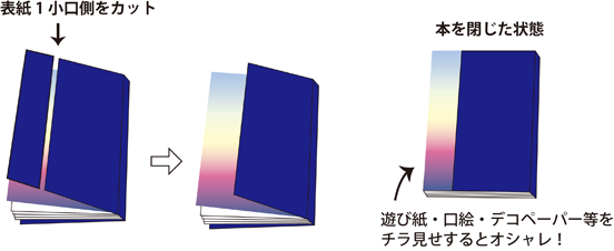 - 表紙を短くカットして遊び紙や口絵をチラ見せ!