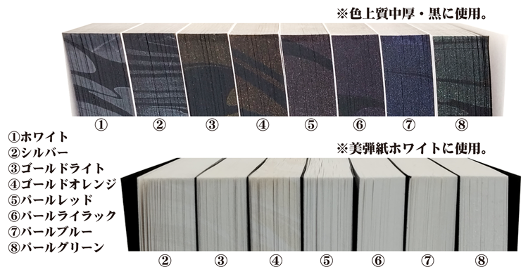 ホワイト・シルバー・ゴールドライト・ゴールドオレンジ・パールレッド・パールライラック・パールブルー・パールグリーン