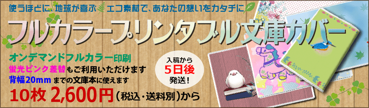※本と同梱の場合は無料になります。(同梱をされる場合はフルカラープリンタブル文庫カバーと本を同日、朝10時までに入稿してください)